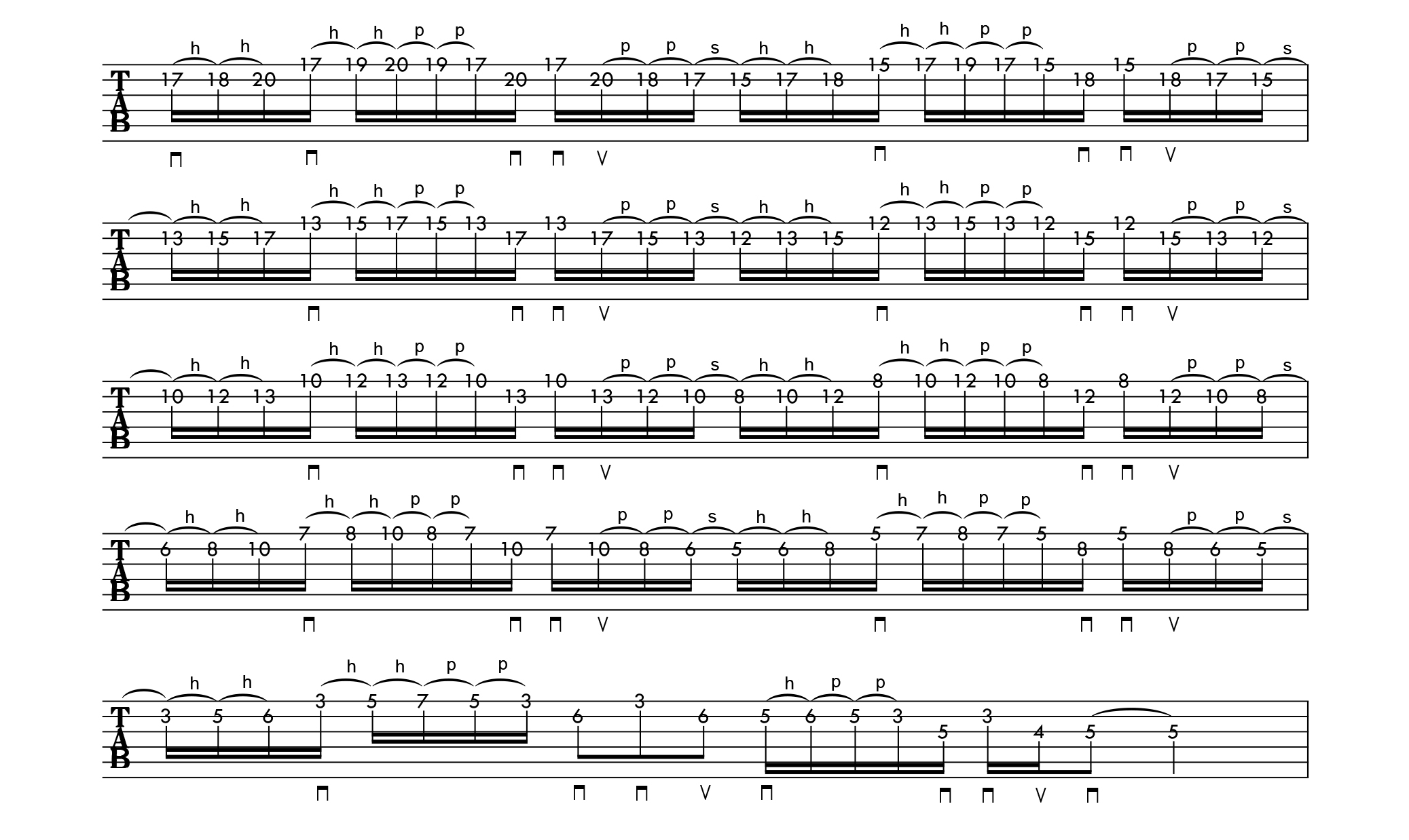 今回のTAB譜は便宜上4音一括り、5音一括りにしていますが、